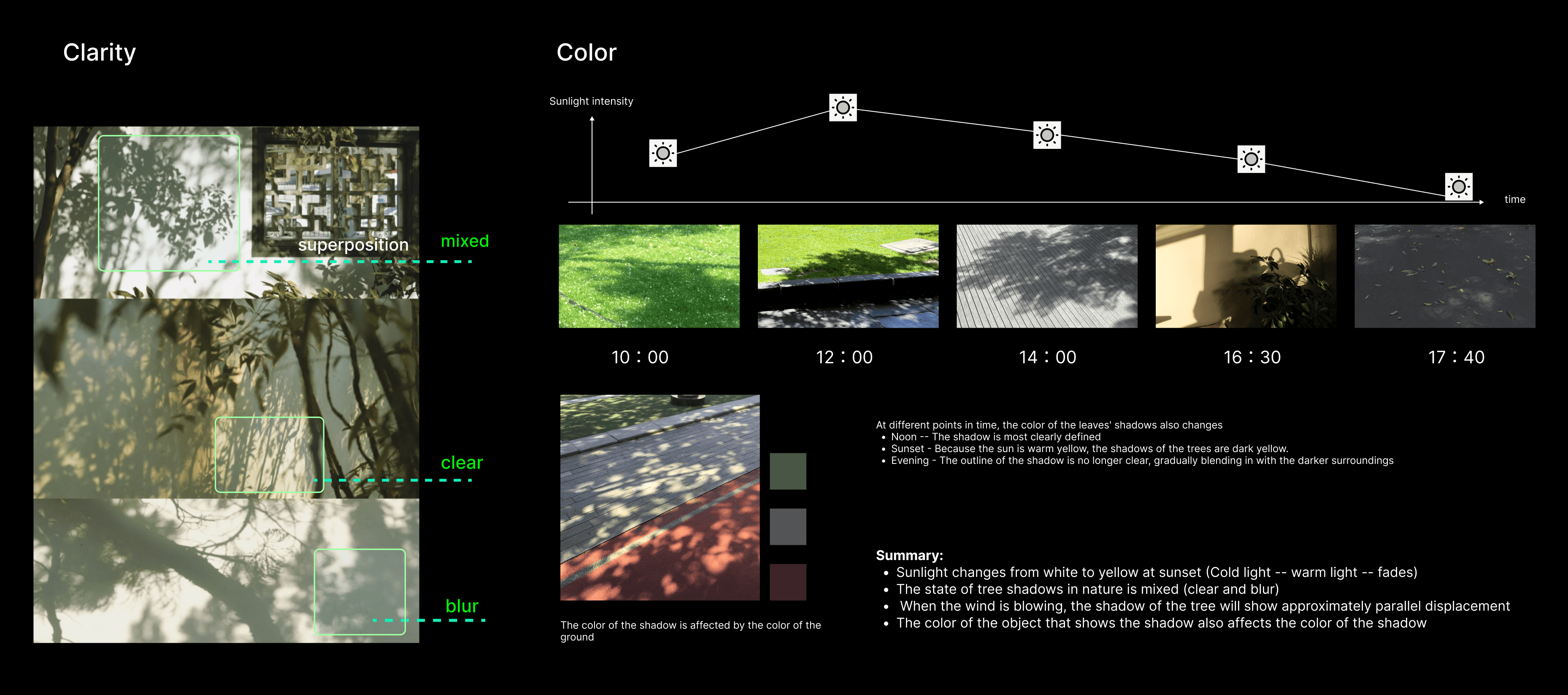 In this project, studying the formation of natural light and shadows is crucial as it aids in creating a genuine natural environment and ambiance. Understanding the direction, intensity of natural light, and the distribution of shadows allows for a more accurate simulation of outdoor lighting conditions, enhancing the authenticity of the design. By mimicking the variations in natural light and shadow effects, we can amplify users' emotional experiences, generating a more appealing and captivating result.